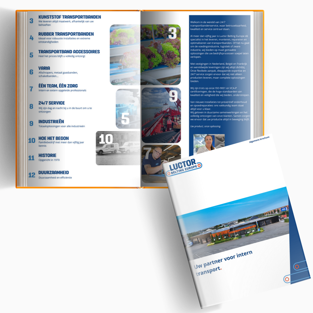 In deze folder vertellen we onder andere over de geschiedenis van Luctor Belting Europe, onze aanpak, onze 24 uur service en transportbanden & transport accessoires.